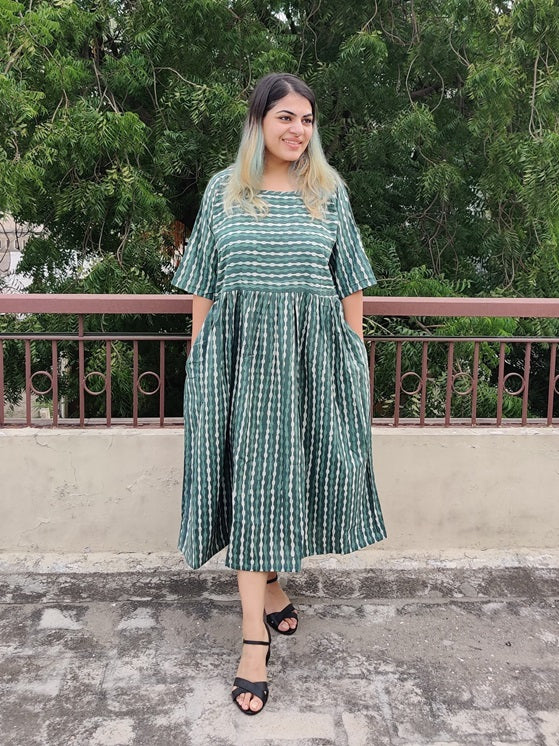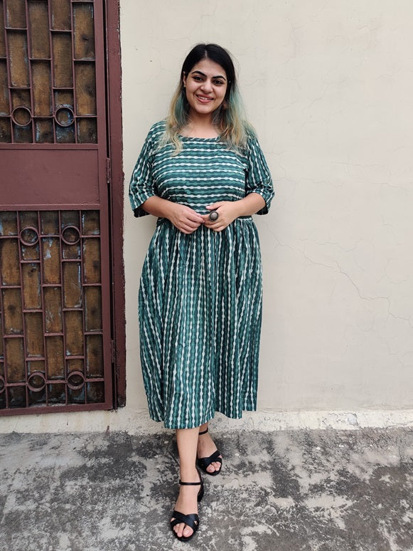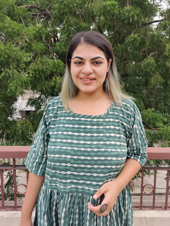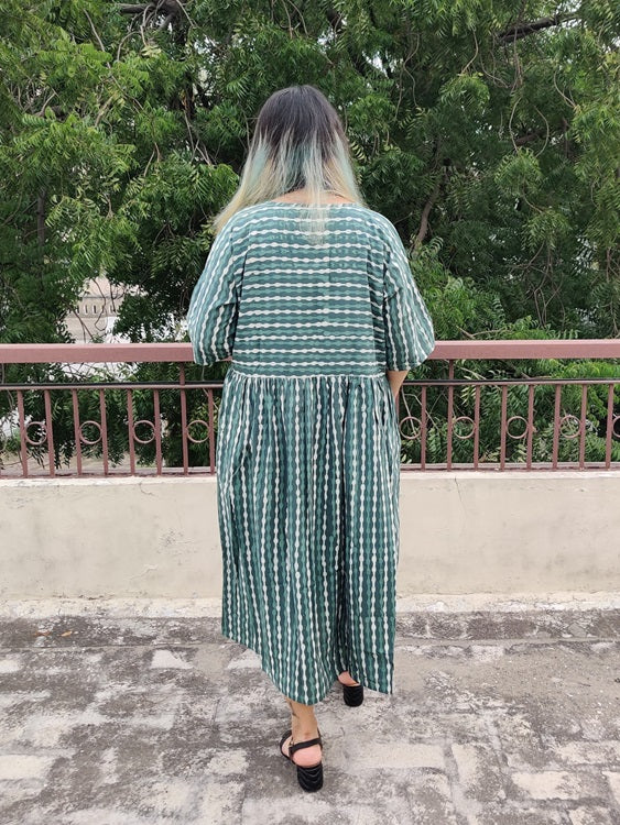 Made with 100% cotton hand block printed fabric, our teal comfort fit dress comes in one size which fits all body types. It comes with a round neck and pockets on both sides. It doesn't have a shoulder joint which helps with the adjustment for every size.