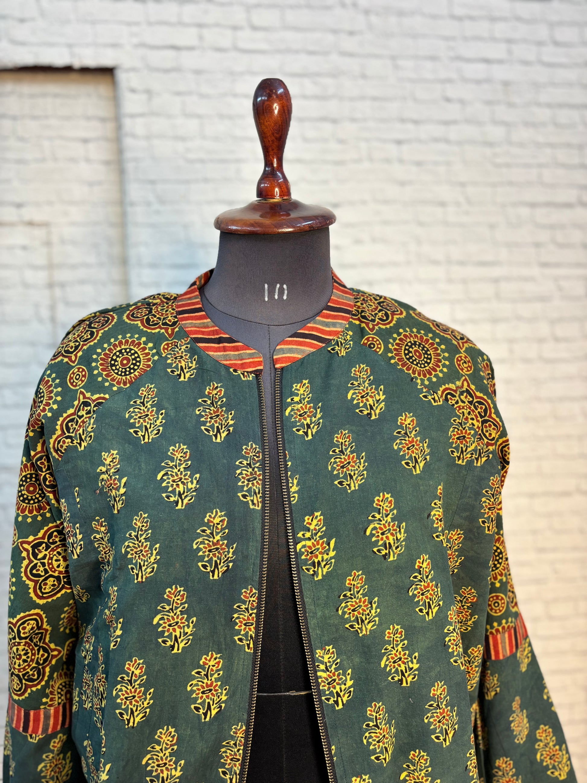 Stay warm, stylish, and effortlessly boho with our handcrafted Hand Block Printed Bomber Jacket. Designed using three beautifully coordinated hand block prints, this jacket blends traditional artistry with modern comfort. The outer layer is made from soft cotton hand block-printed fabric, while the inside features a warm spun lining ; perfect for winters and light enough for breezy weather.