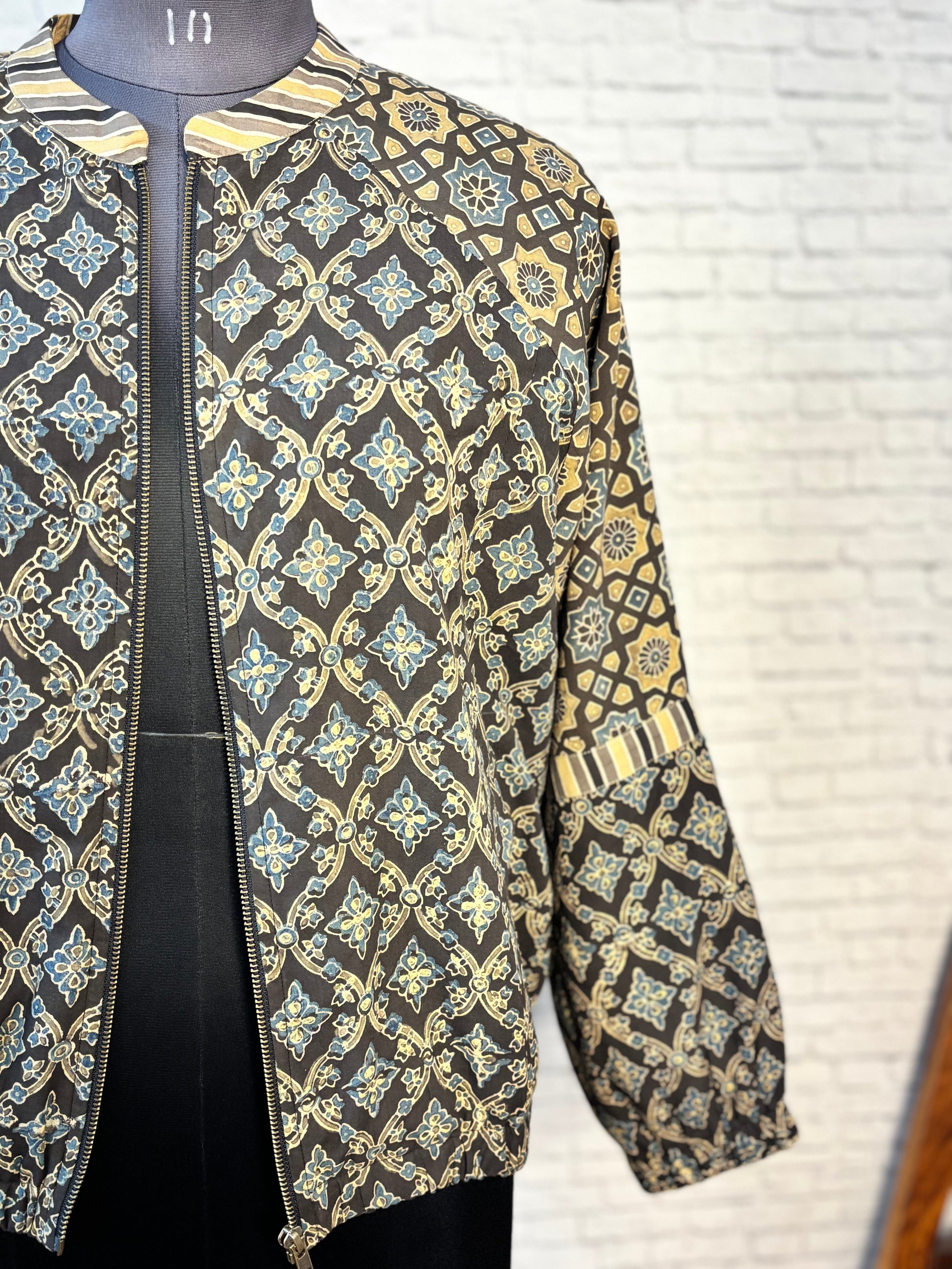 Stay warm, stylish, and effortlessly boho with our handcrafted Hand Block Printed Bomber Jacket. Designed using three beautifully coordinated hand block prints, this jacket blends traditional artistry with modern comfort. The outer layer is made from soft cotton hand block-printed fabric, while the inside features a warm spun lining ; perfect for winters and light enough for breezy weather.