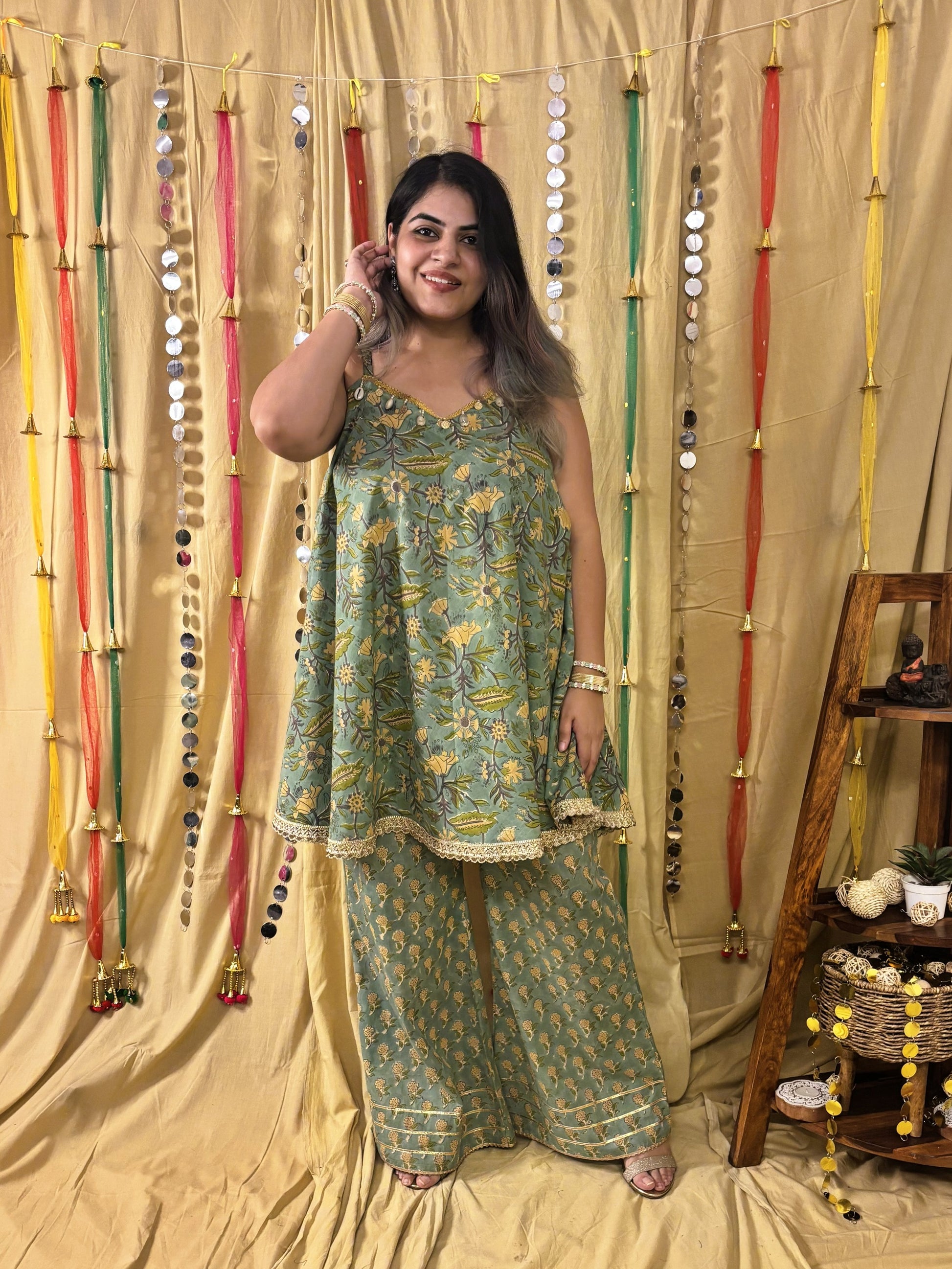 Soft, soothing, and full of festive ease — the Hoor Set in refreshing sage green with mustard and ivory floral hand block prints is a picture of effortless elegance. Crafted from 100% pure cotton, this co-ord features a flared top paired with fit-and-flare bell-bottom pants for a fluid, flattering silhouette. The adjustable spaghetti straps and gota detailing along the neckline, hem, and pant ends add the perfect festive shimmer, while the elasticated waist and side pockets ensure all-day comfort.