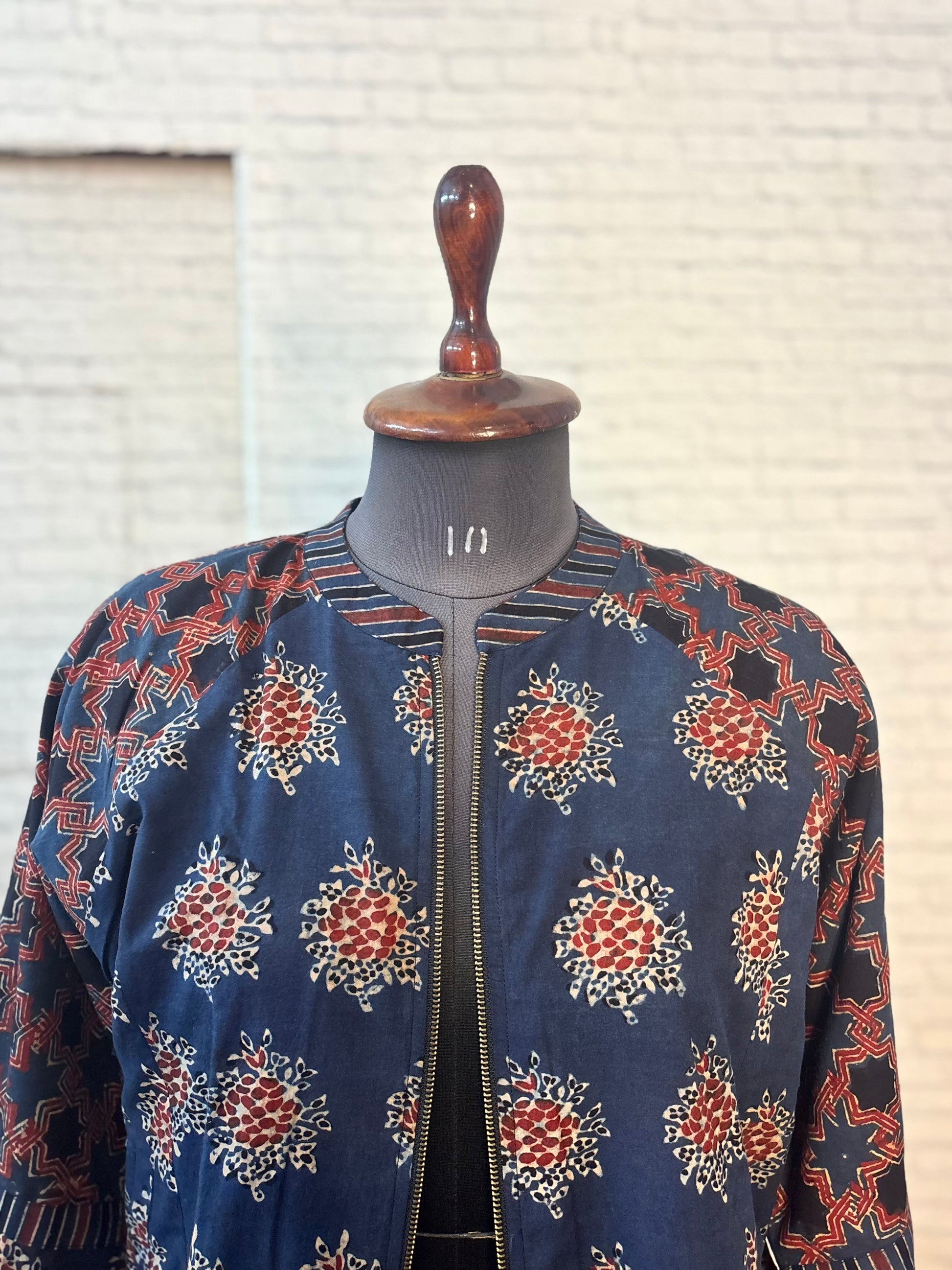 Stay warm, stylish, and effortlessly boho with our handcrafted Hand Block Printed Bomber Jacket. Designed using three beautifully coordinated hand block prints, this jacket blends traditional artistry with modern comfort. The outer layer is made from soft cotton hand block-printed fabric, while the inside features a warm spun lining ; perfect for winters and light enough for breezy weather.
