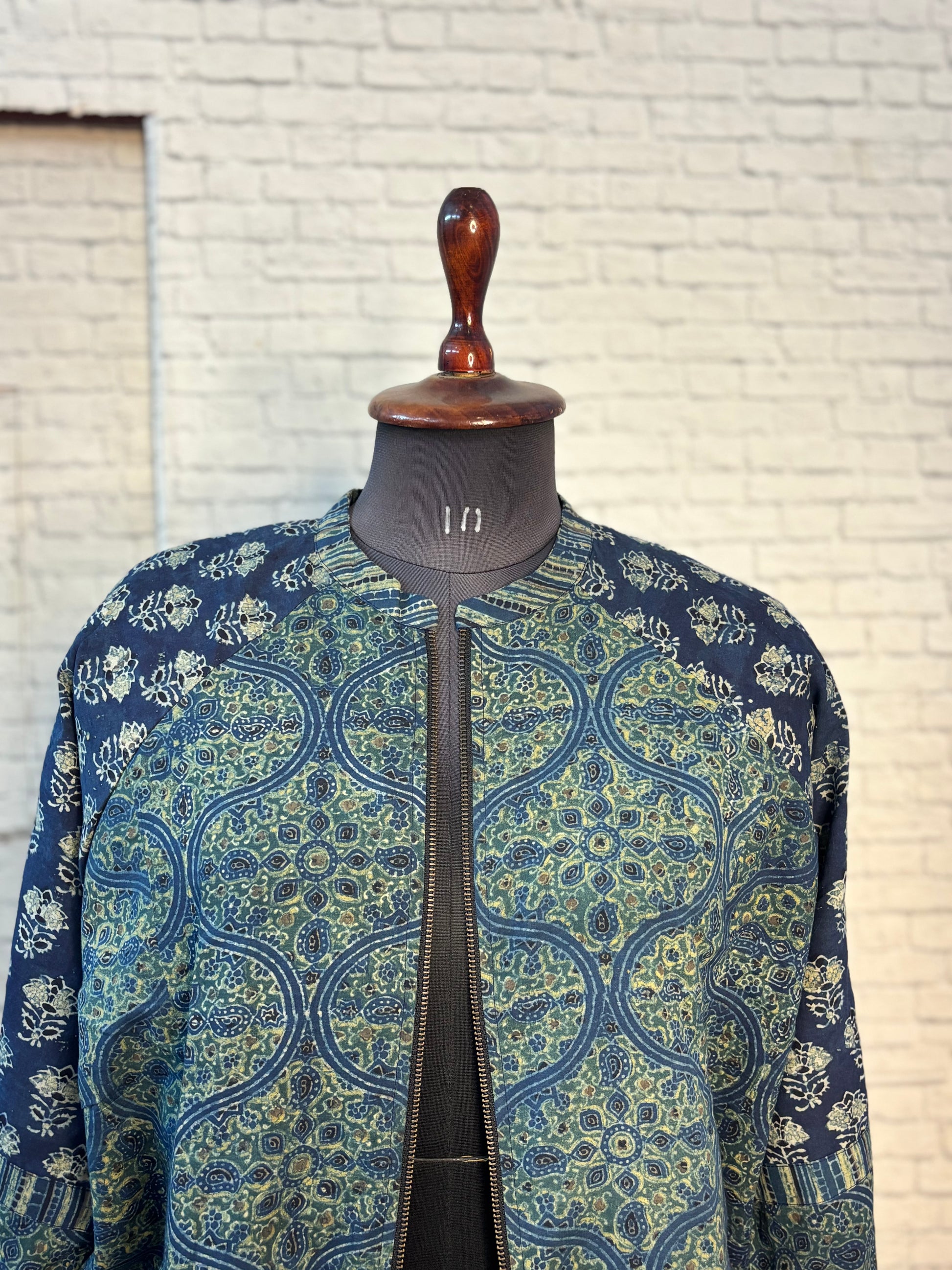 Indigo Green Ajrakh Hand Block Printed Unisex Bomber Jacket