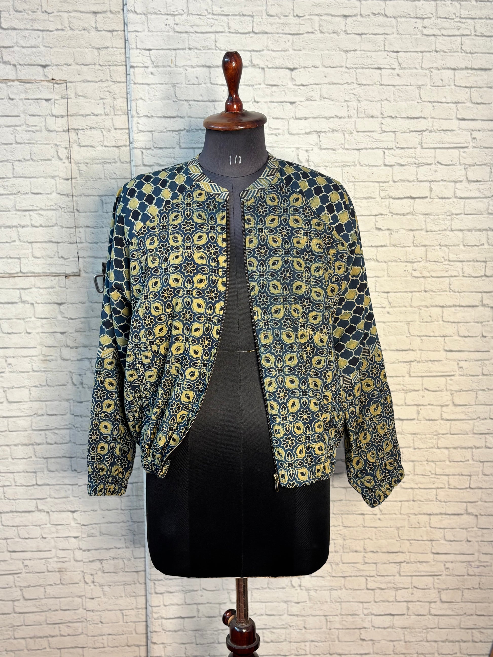 Indigo Green Hand Block Printed Unisex Bomber Jacket