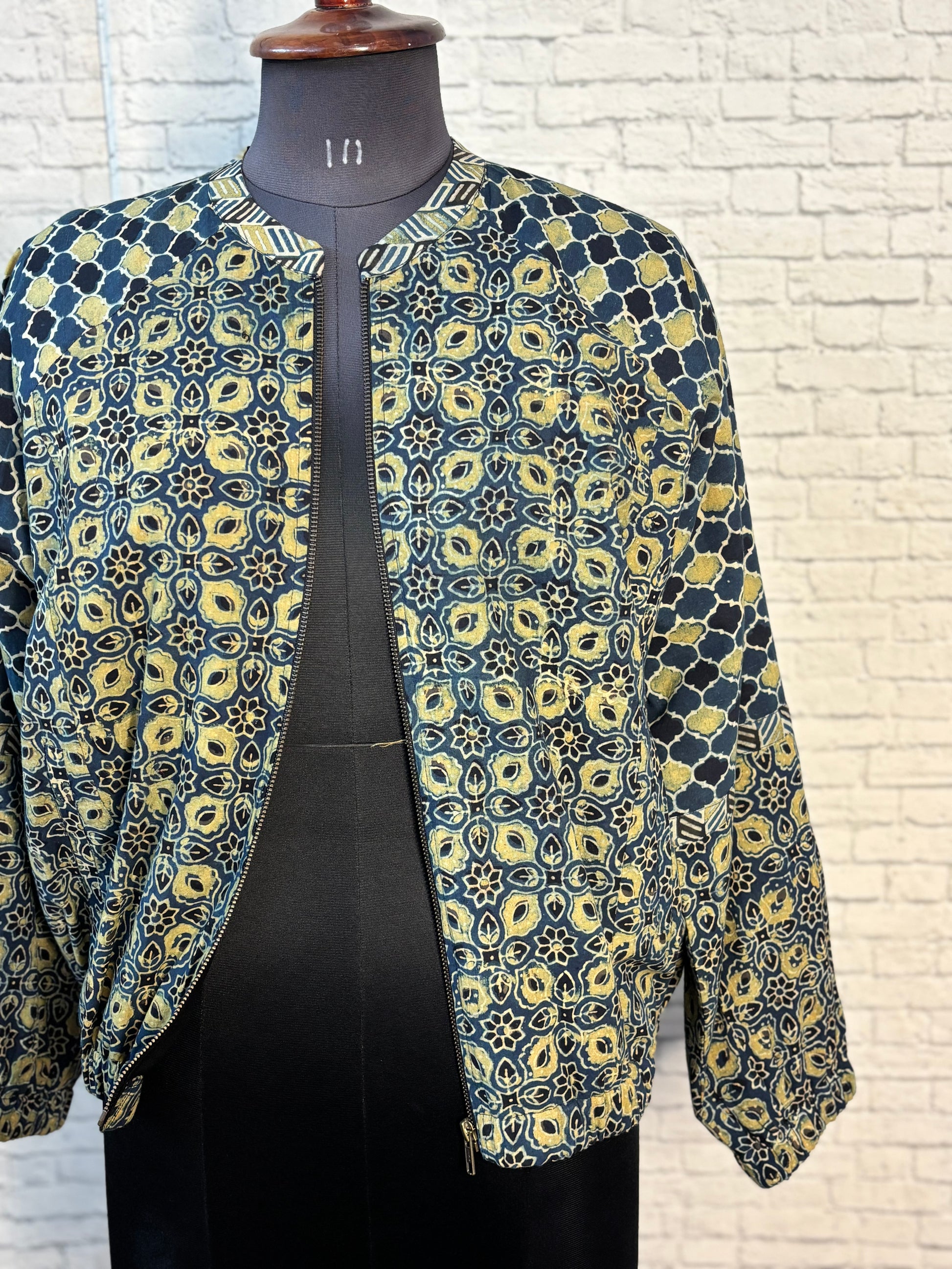 Stay warm, stylish, and effortlessly boho with our handcrafted Hand Block Printed Bomber Jacket. Designed using three beautifully coordinated hand block prints, this jacket blends traditional artistry with modern comfort. The outer layer is made from soft cotton hand block-printed fabric, while the inside features a warm spun lining ; perfect for winters and light enough for breezy weather.