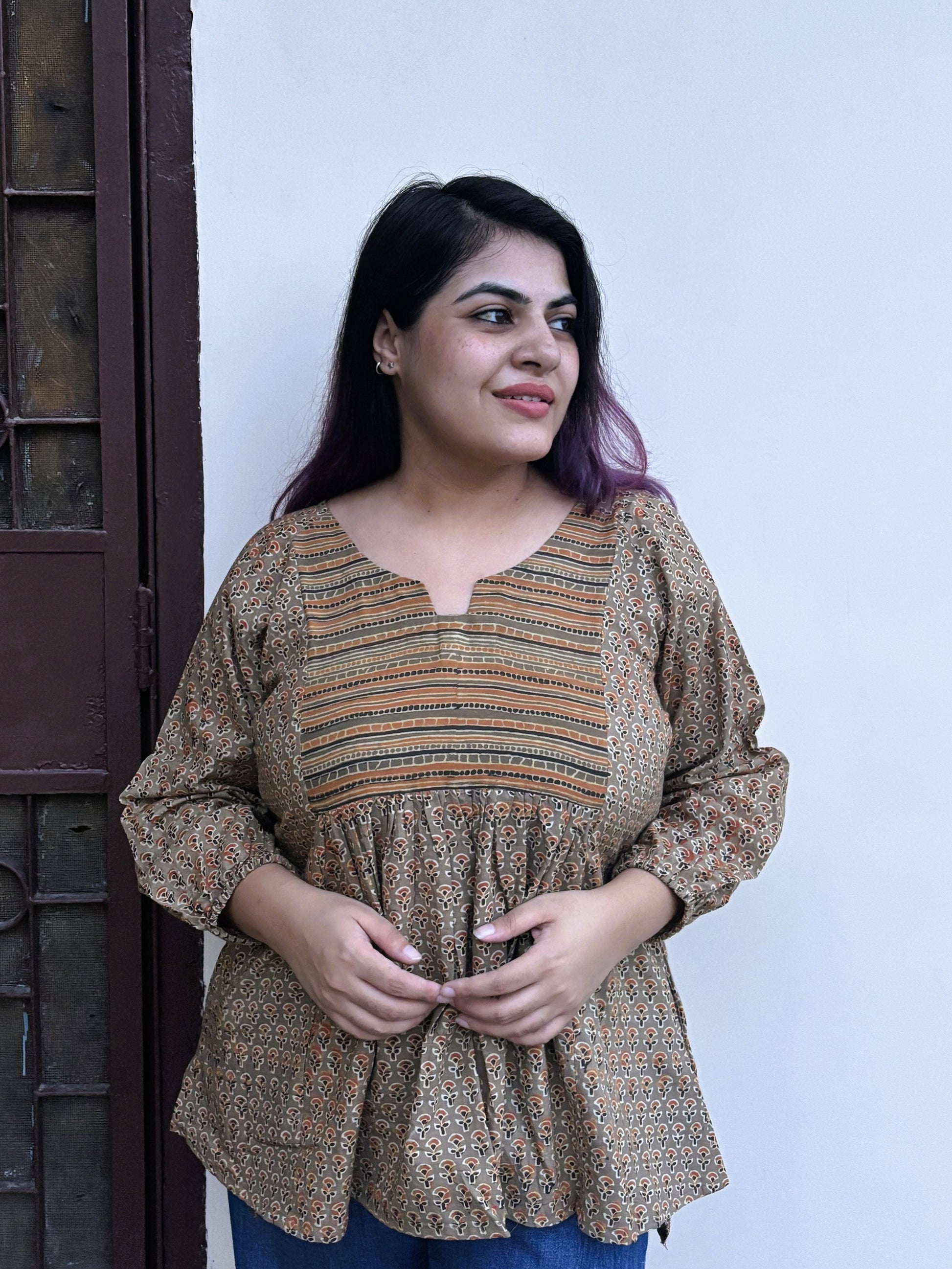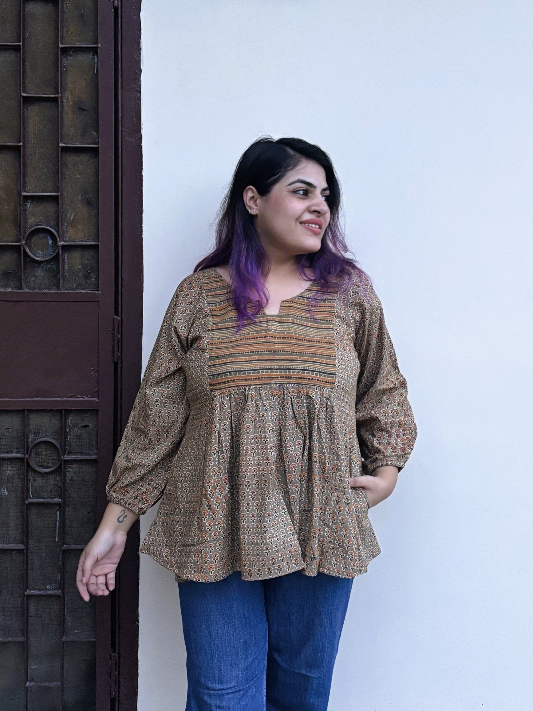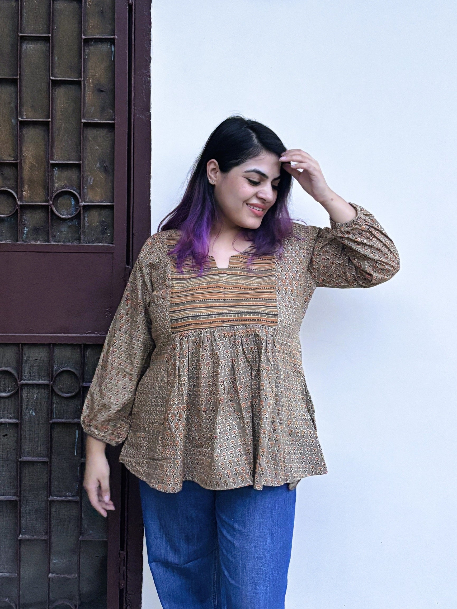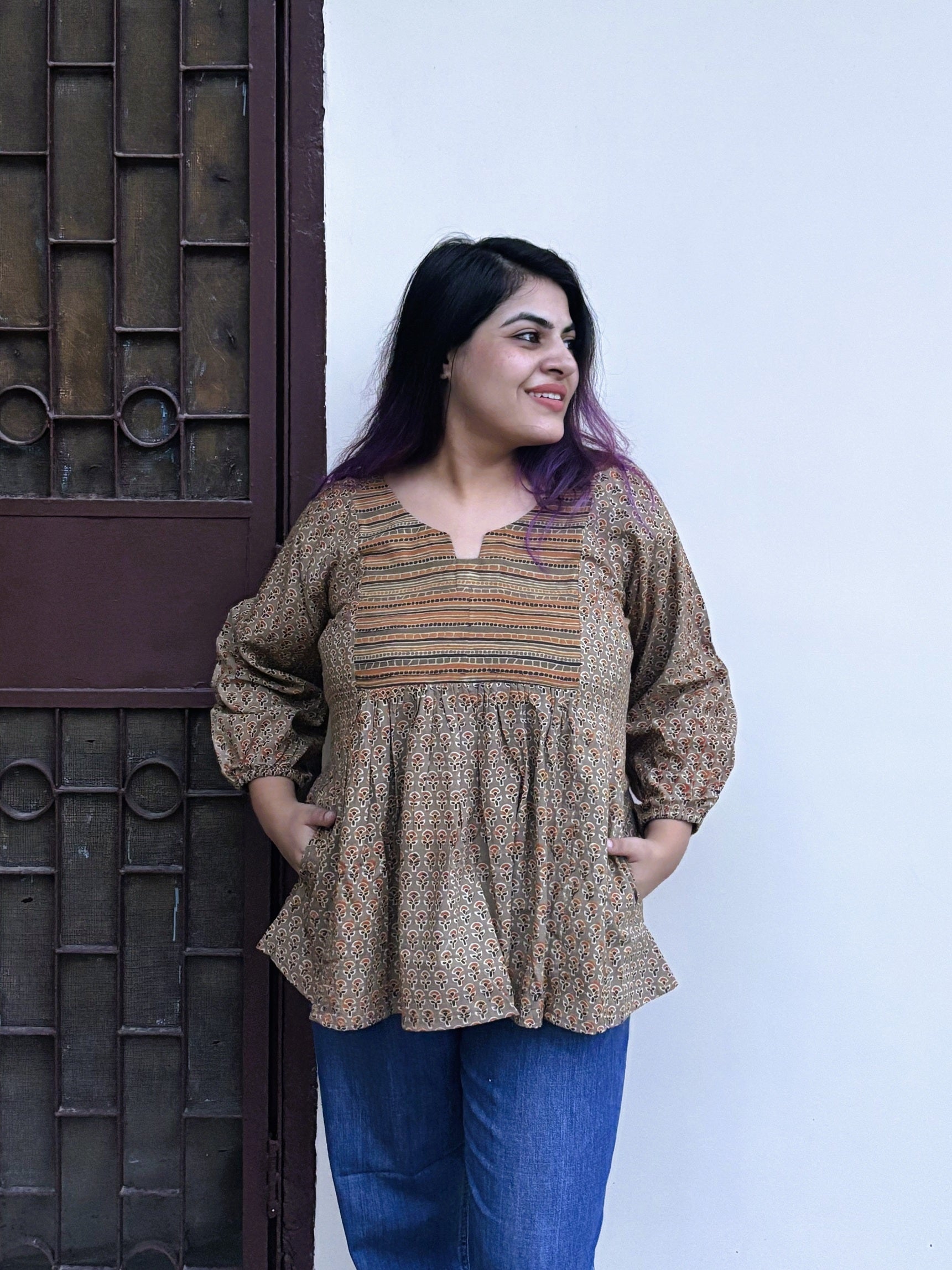 Embrace the bohemian spirit with our Kashish Orange Hand Block Printed Boho Top with Back Drawstring, crafted from 100% cotton ajrakh hand block printed fabric. This top exudes a carefree vibe with gathers in the front, intricate detailing on the neck and back, and a back cut with drawstring adorned with shells for added charm. The lantern sleeves add a whimsical touch, while the elastic at the end ensures maximum comfort. Perfect for a casual day out or a relaxed evening, this top is a versatile addition to your wardrobe that effortlessly combines style and comfort.