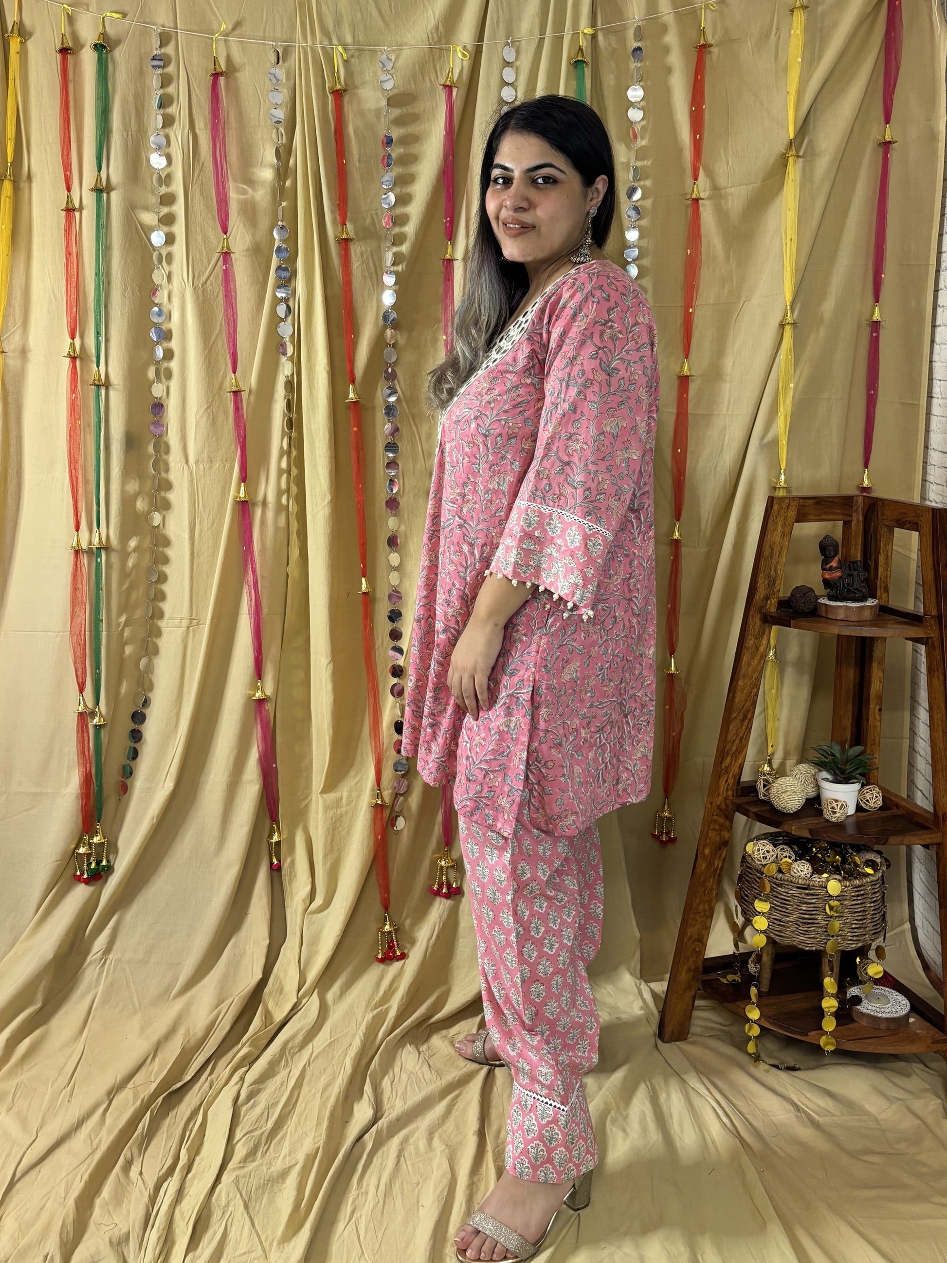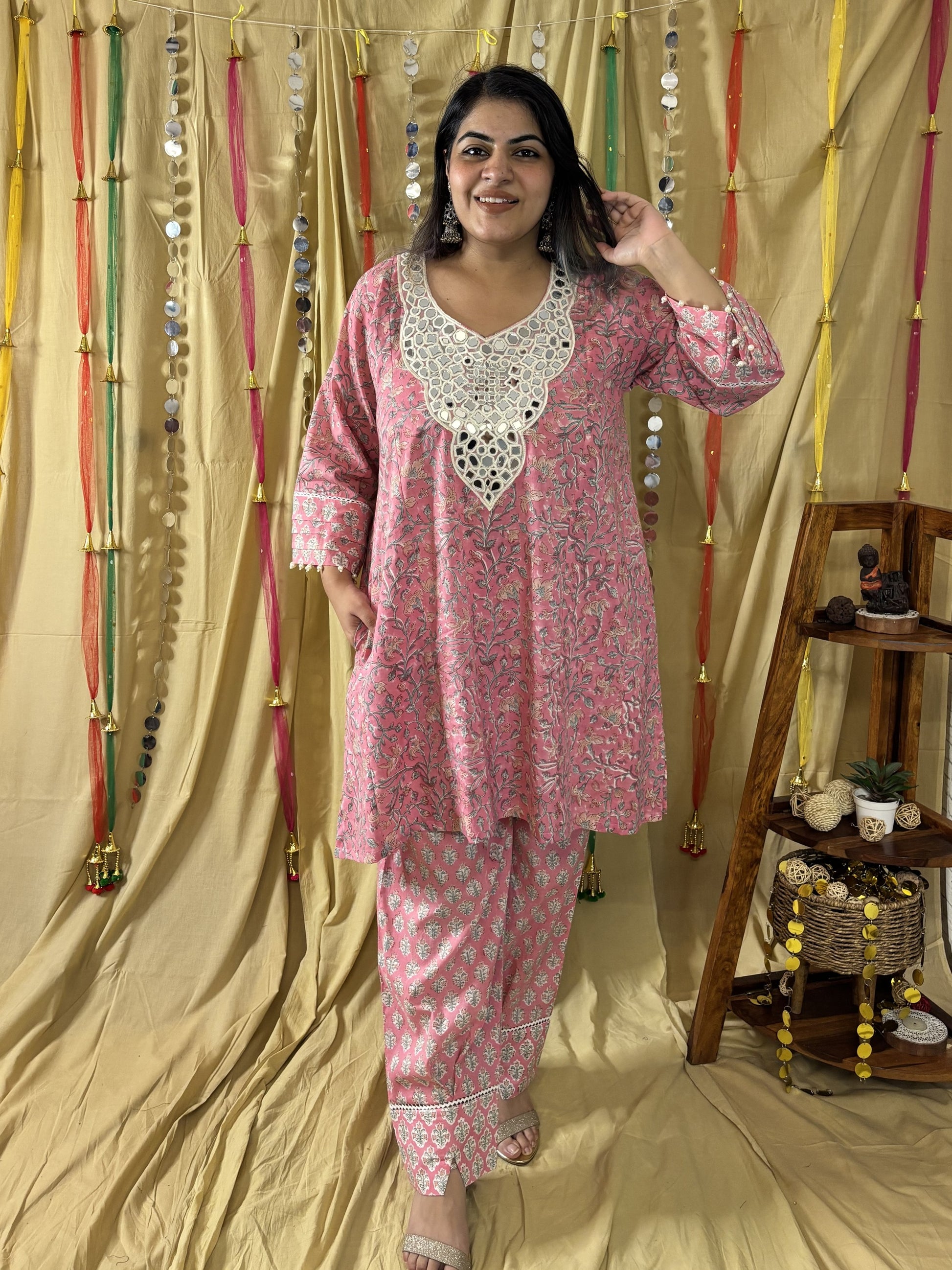 A celebration of grace and craft, the Pariza Set brings a touch of elegance to everyday festivities. Hand block printed on 100% pure cotton in soft shades of blush pink and grey floral motifs, this set features a Pakistani choga-style short kurti paired with comfortable Afghani sAlwar. The kurti stands out with its stunning mirror-work yoke, detailed pleats, and lace-trimmed sleeves finished with delicate bead accents adding a festive sparkle to this timeless silhouette.