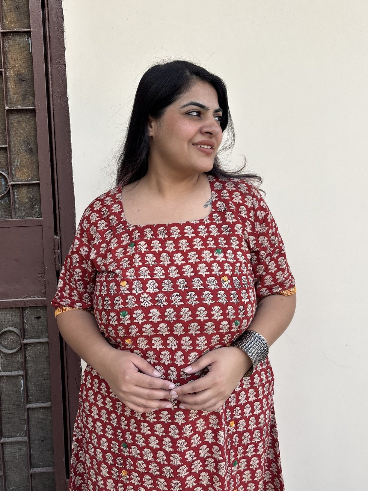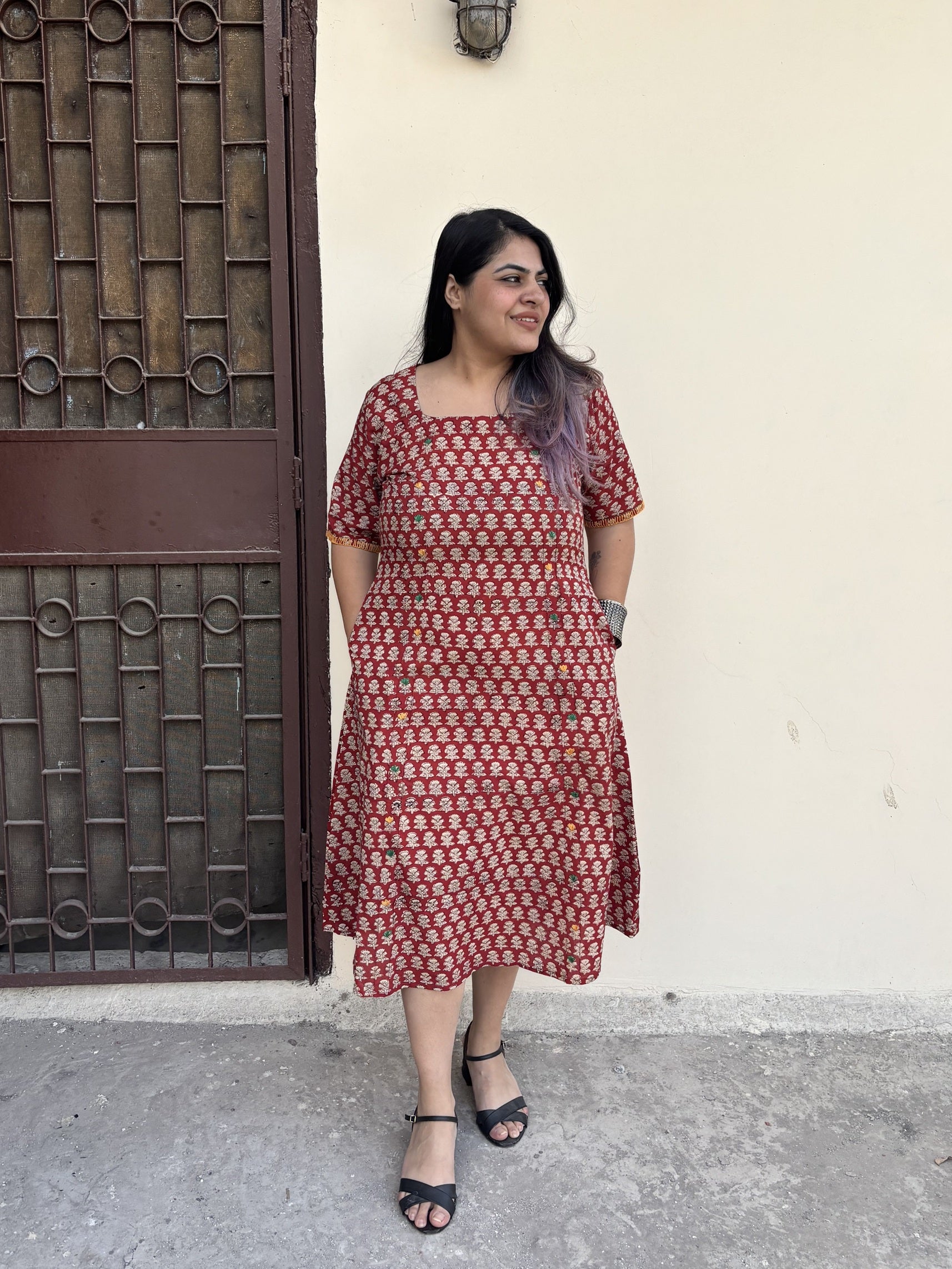 Crafted from 100% breathable cotton, this midi dress features a rich rust base with classic hand block printed motifs. Delicate hand embroidery highlights the print, adding small pops of colour that bring the fabric to life while keeping the look subtle and elegant.