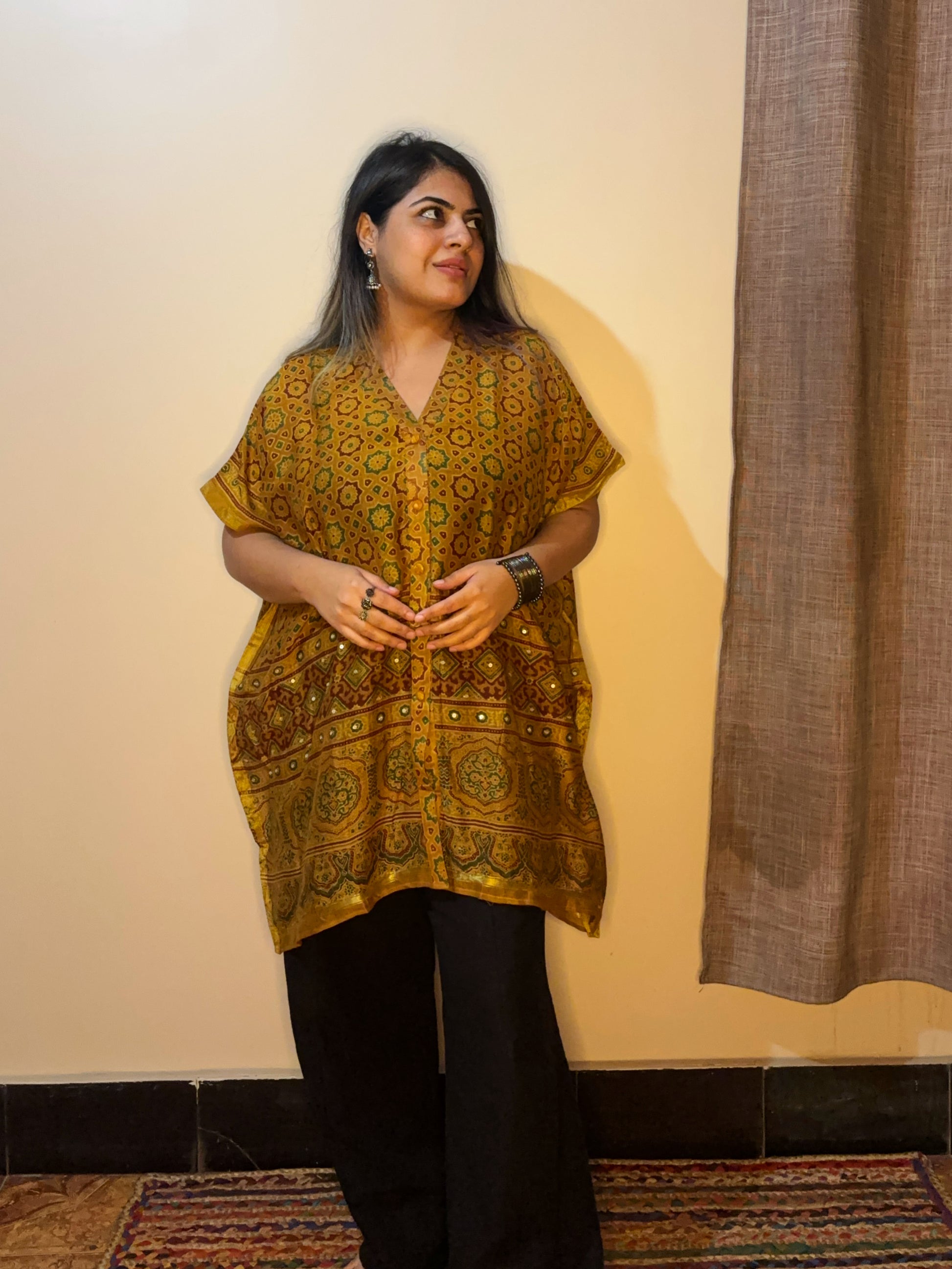 Yellow Ajrakh Chanderi Shirt Kaftan with Sequin Detailing