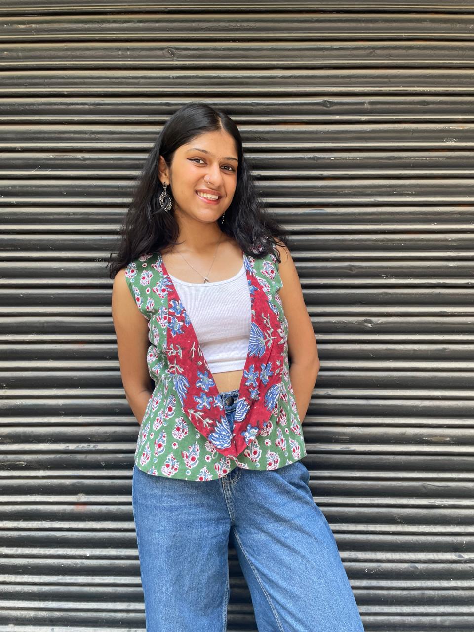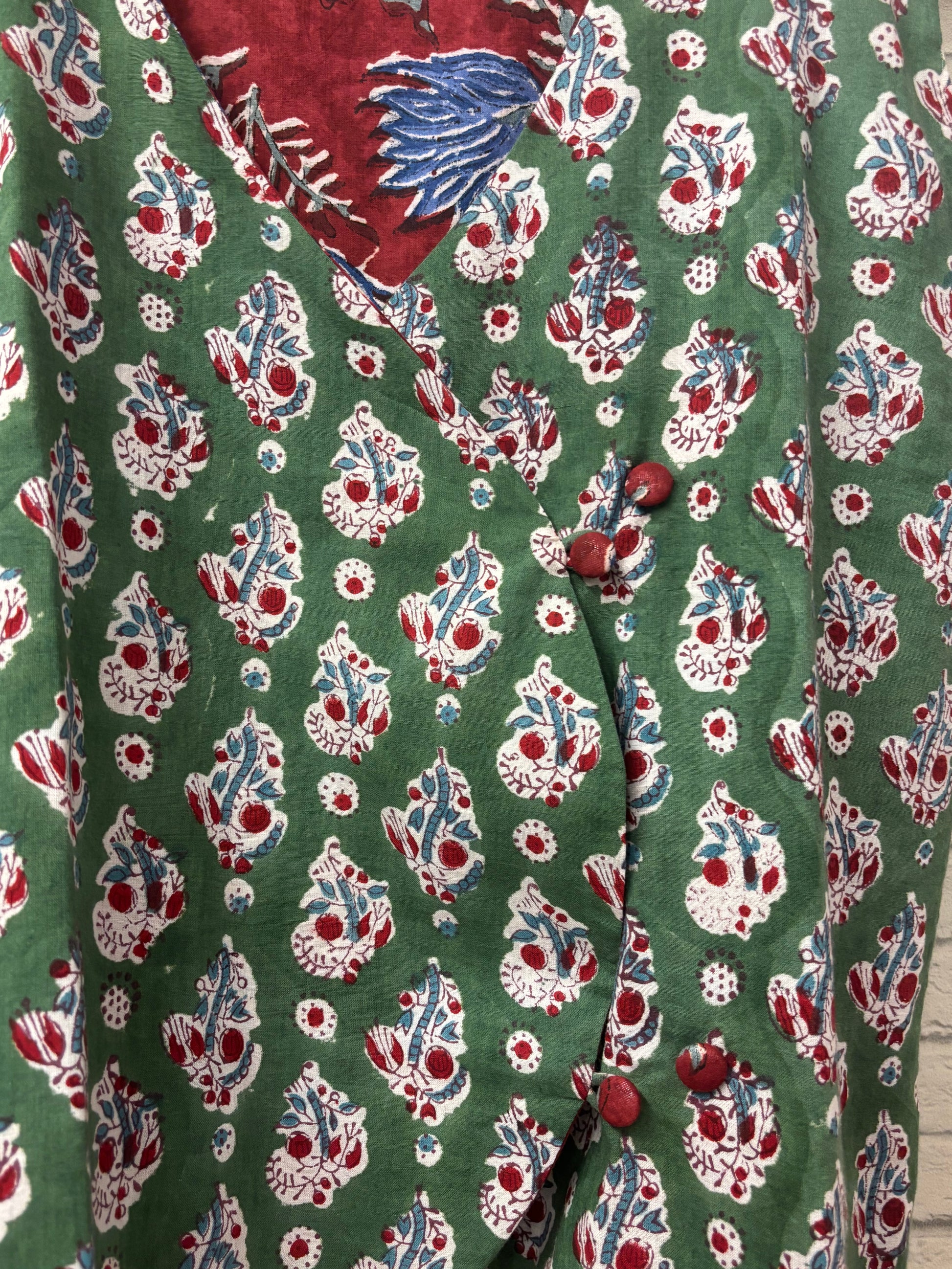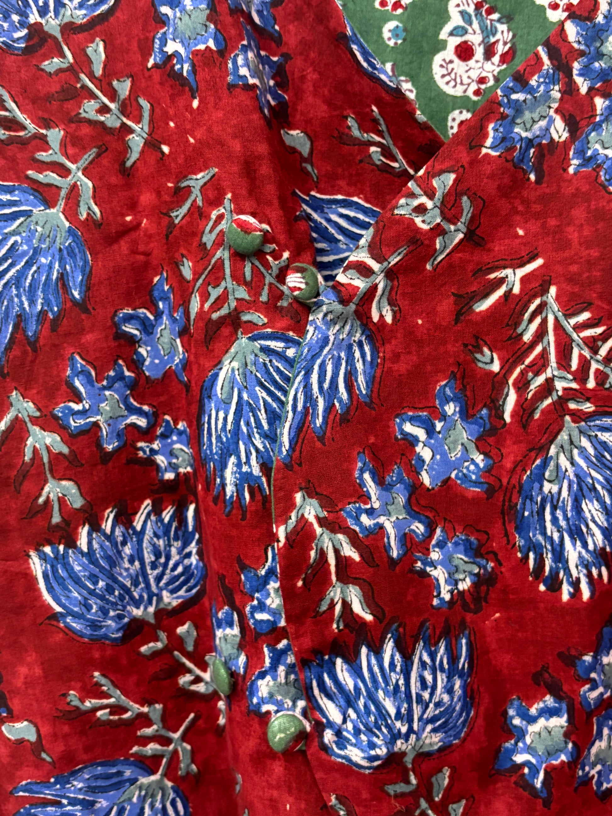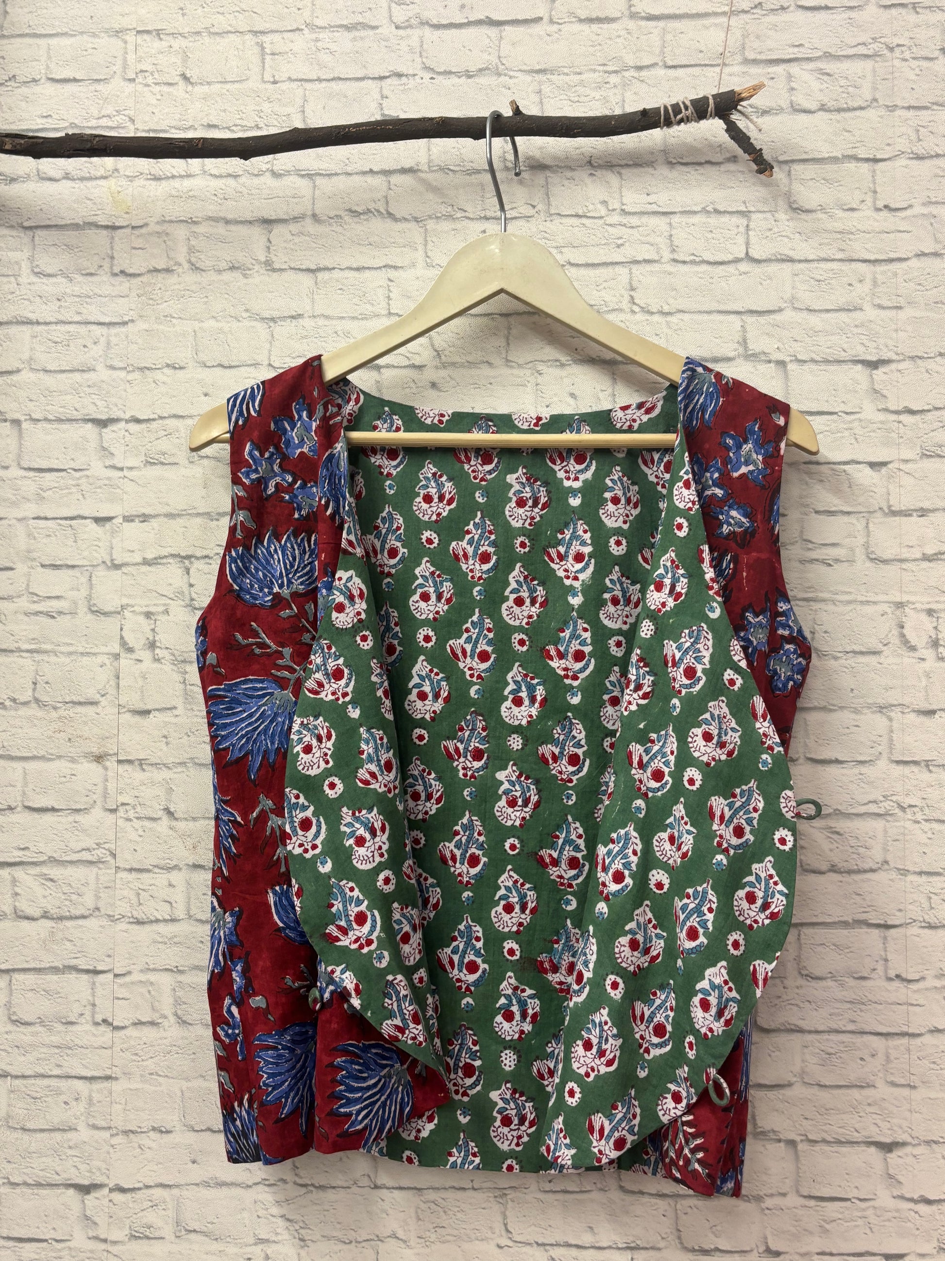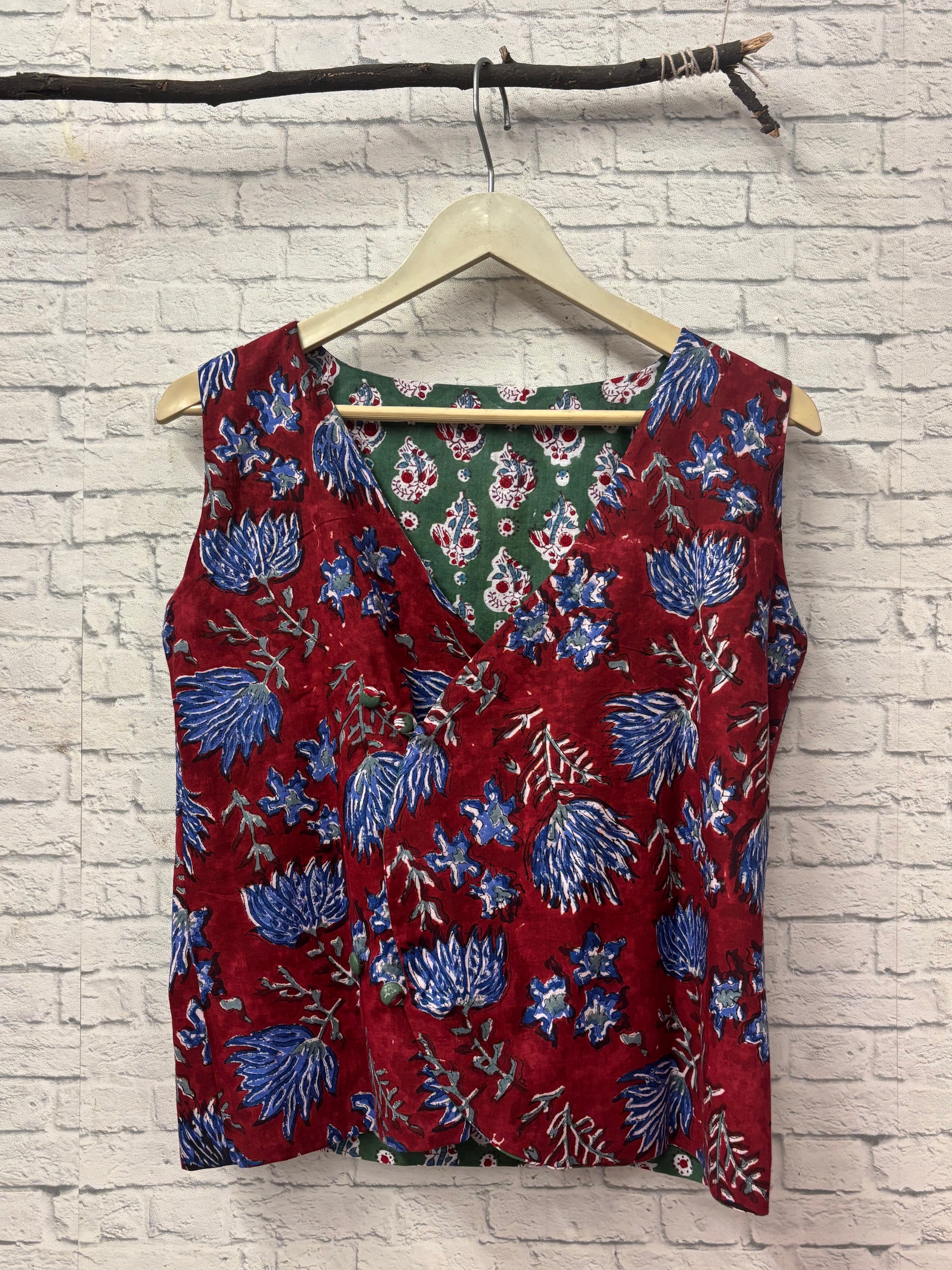 sides and an adjustable fit, it offers four distinct styling options in one garment. With green floral fabric on one side and red fabric on the other side, crafted from hand block printed fabric by skilled artisans, this sleeveless waistcoat flatters all body types and layers effortlessly over dresses, kurtis, or even a simple tee and jeans. Whether you are dressing up for a meeting or adding character to a casual outfit or simply style it on its own, it brings just the right touch of polish and personality.