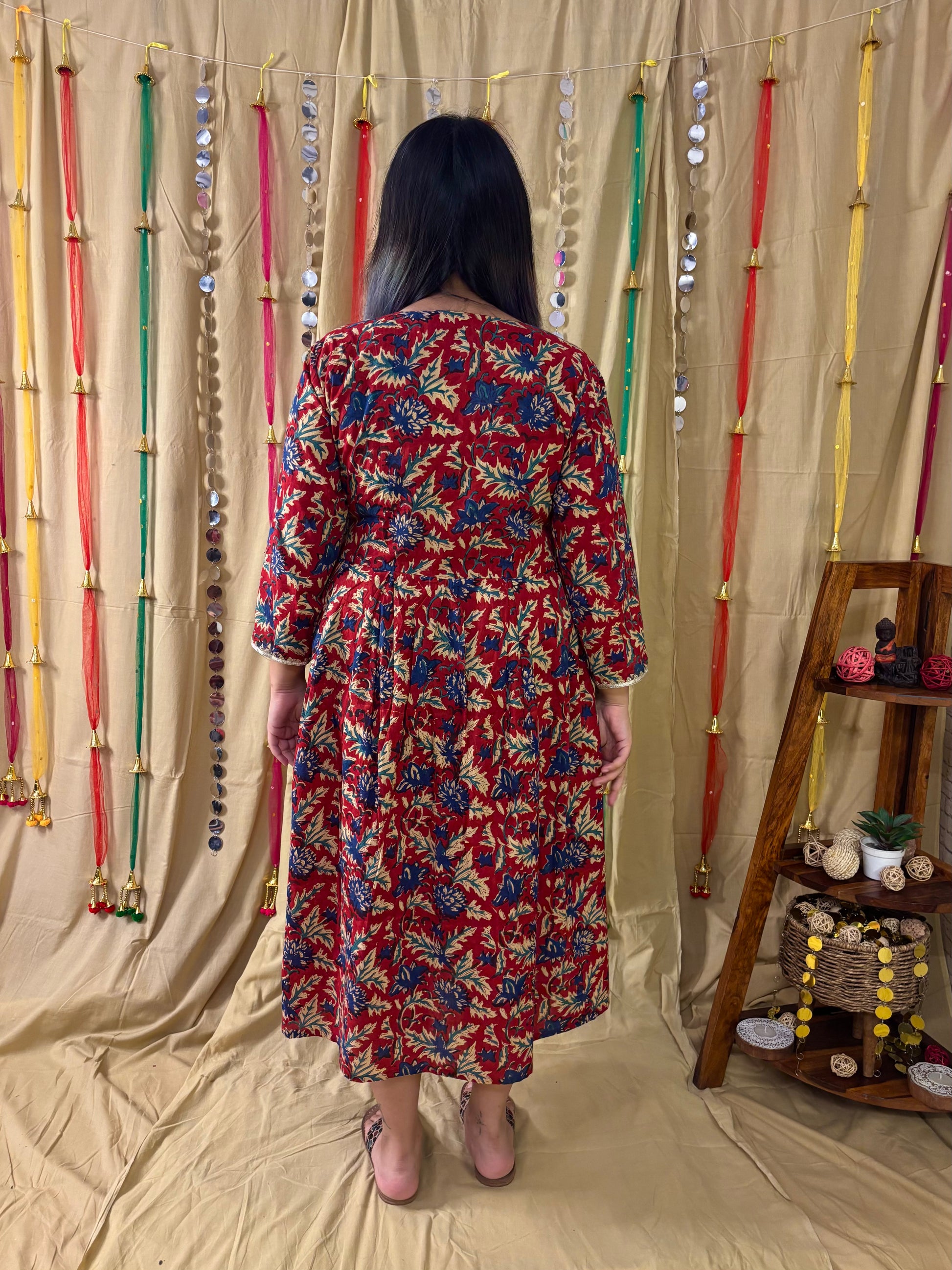Bold, vibrant, and festive at heart, Zareen is crafted in soft cotton with a striking hand block floral print in deep red and indigo hues. Its richness lies in the intricately worked neckline, finished with tagai, delicate hand embroidery, and gota detailing that brings a festive shimmer to the dress.