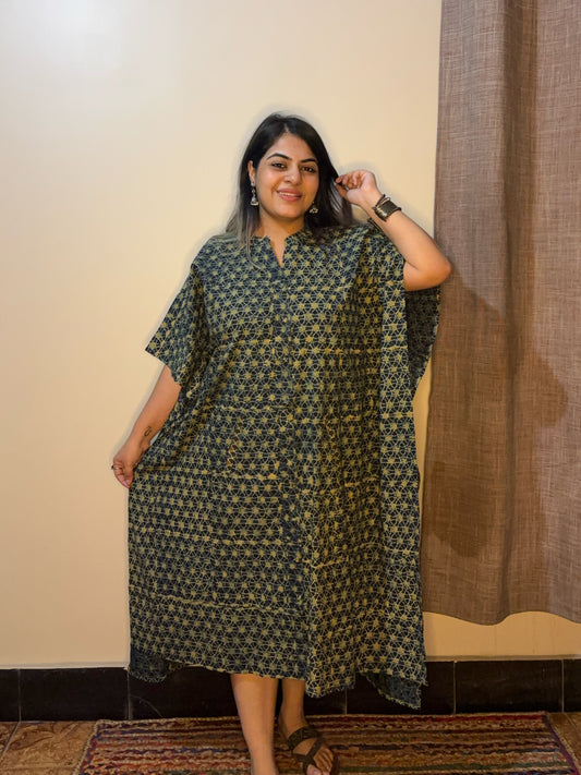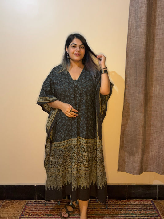Black Olive Green Ajrakh Long Kaftan with Gather and Tassels