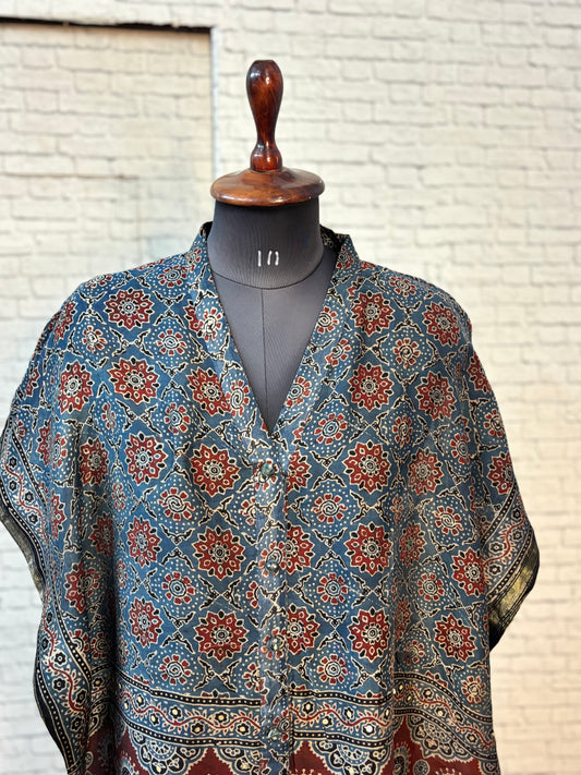 Indigo Red Ajrakh Chanderi Shirt Kaftan with Sequin Detailing
