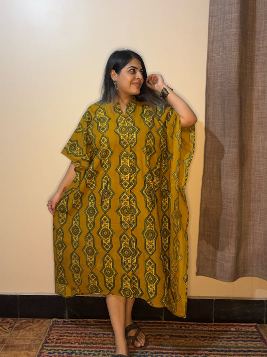 Yellow Green Ajrakh Hand Embroidered Patch Kaftan